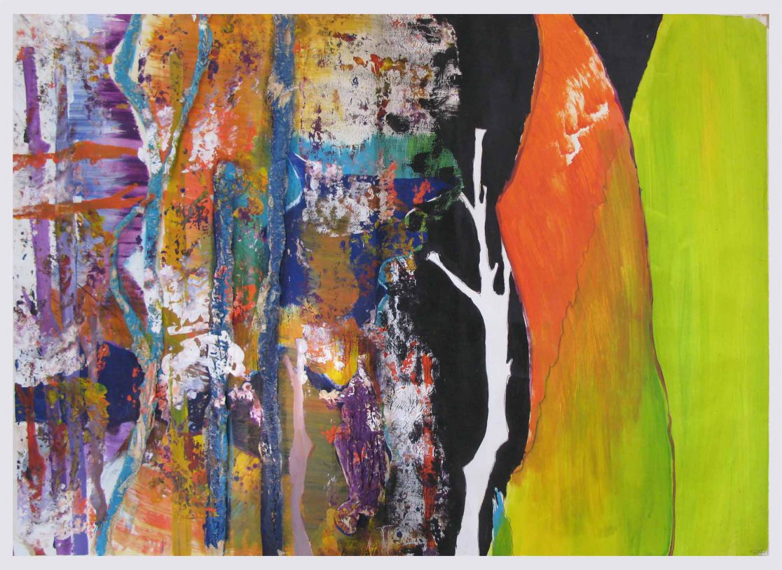 'The Woods'. Gemengde technieken. Acryl & papier maché op papier. 50x70 cm